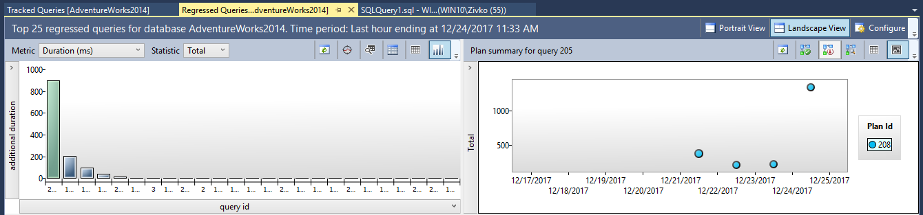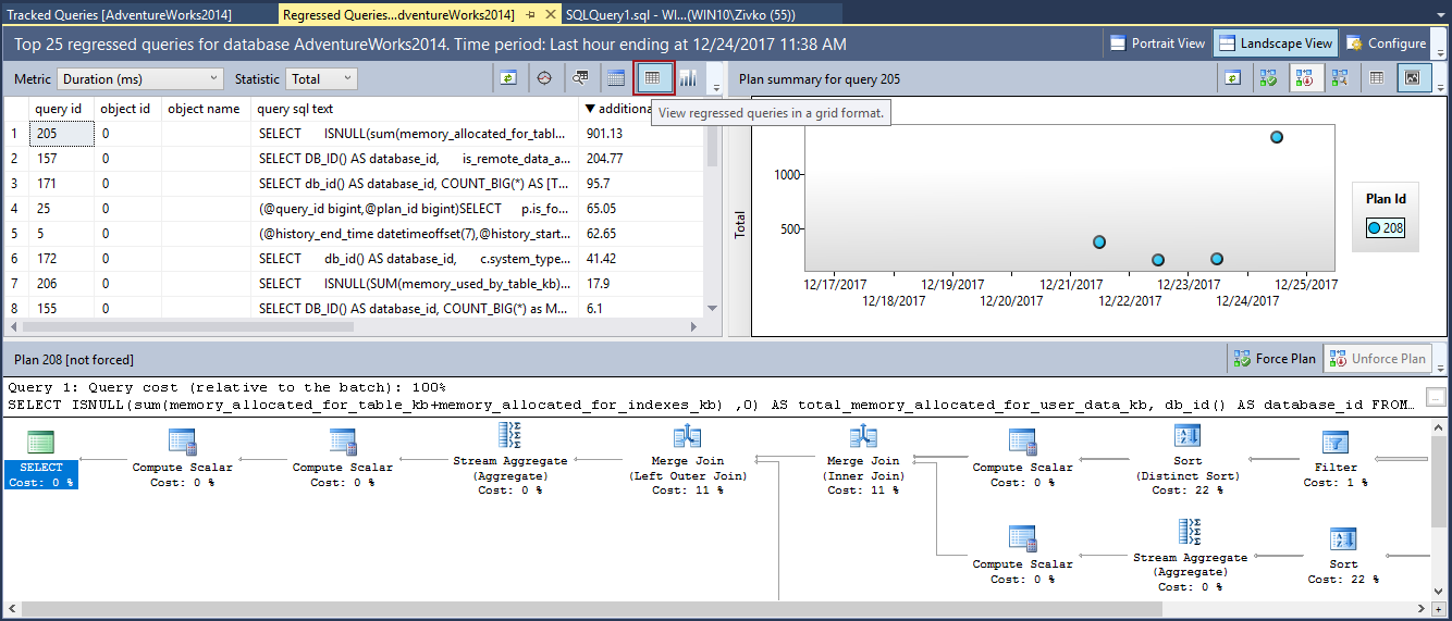 With the Tracked Queries built-in report, query runtime statistics and query Execution plans can be tracked for the specific query over time. In the Tracking query text box, enter the query id (e.g. 205) and press the green play button next to the Tracking query box: