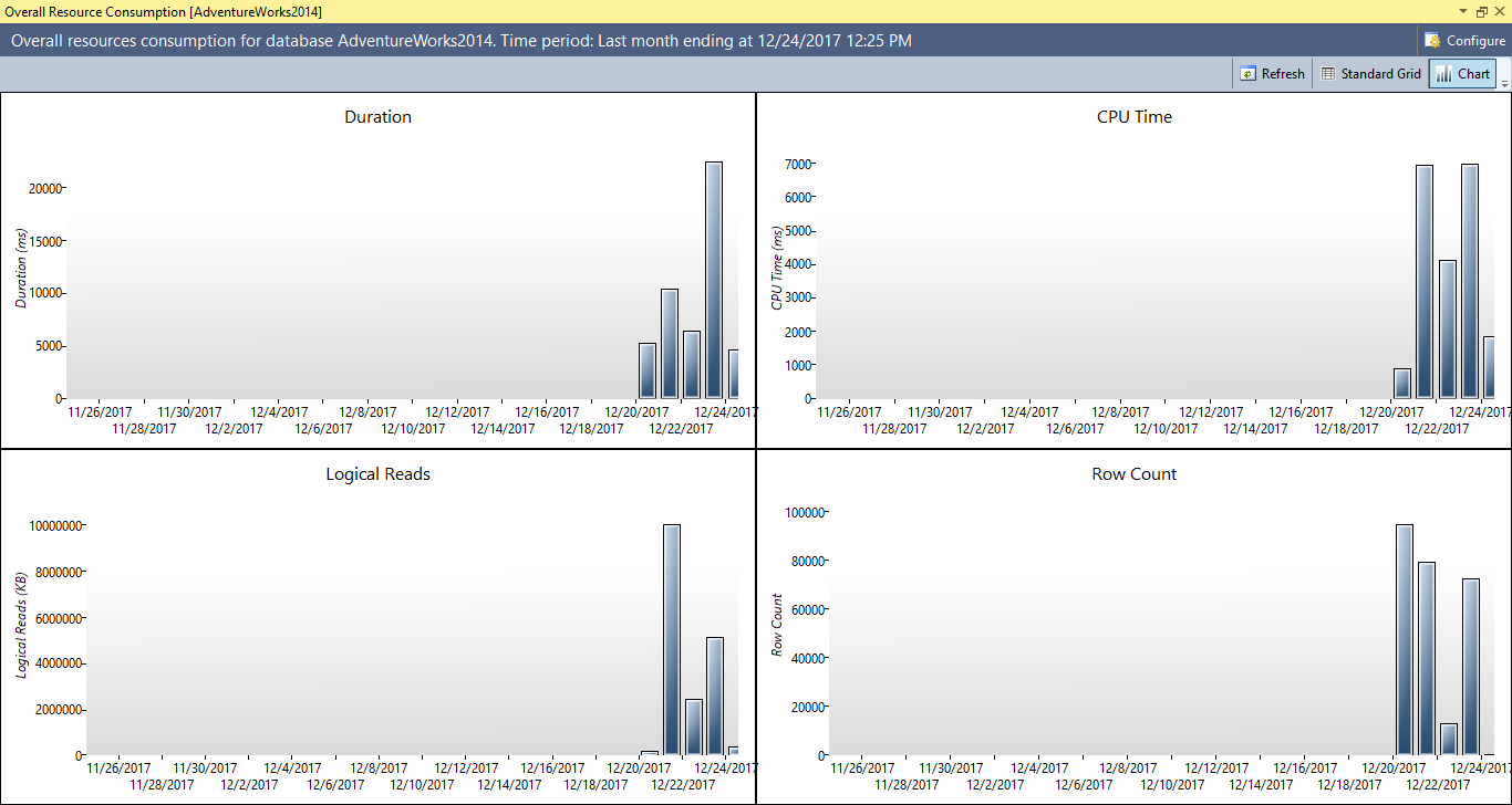 The Overall Resource Consumption built-in report shows summary resource consumption during the specific set of time. By default, results are shown for the last month and the results are shown in four charts: Duration, CPU Time, Logical Reads and Execution count: