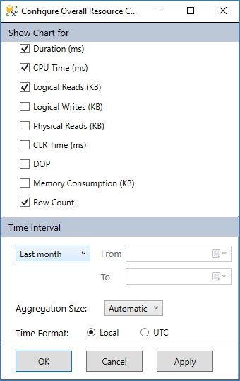 To set additional charts report, time and aggregation interval, press the Configure button and the Configure Overall Resource Consumption dialog will appear where different options can be set for the Overall Resource Consumption report: