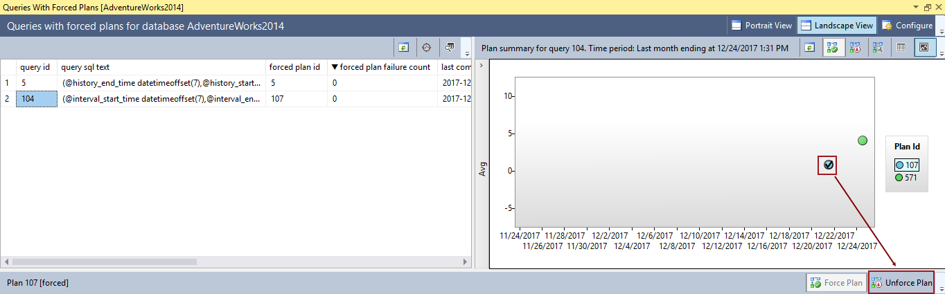 To unforce SQL Server to use a specific Execution Plan for the particle query in the Queries With Forced Plans, Regressed Queries, Top Resource Consuming Queries, Queries With High Variation or Tracked Queries report, select the Execution Plan and press the Unforce Plan button:
