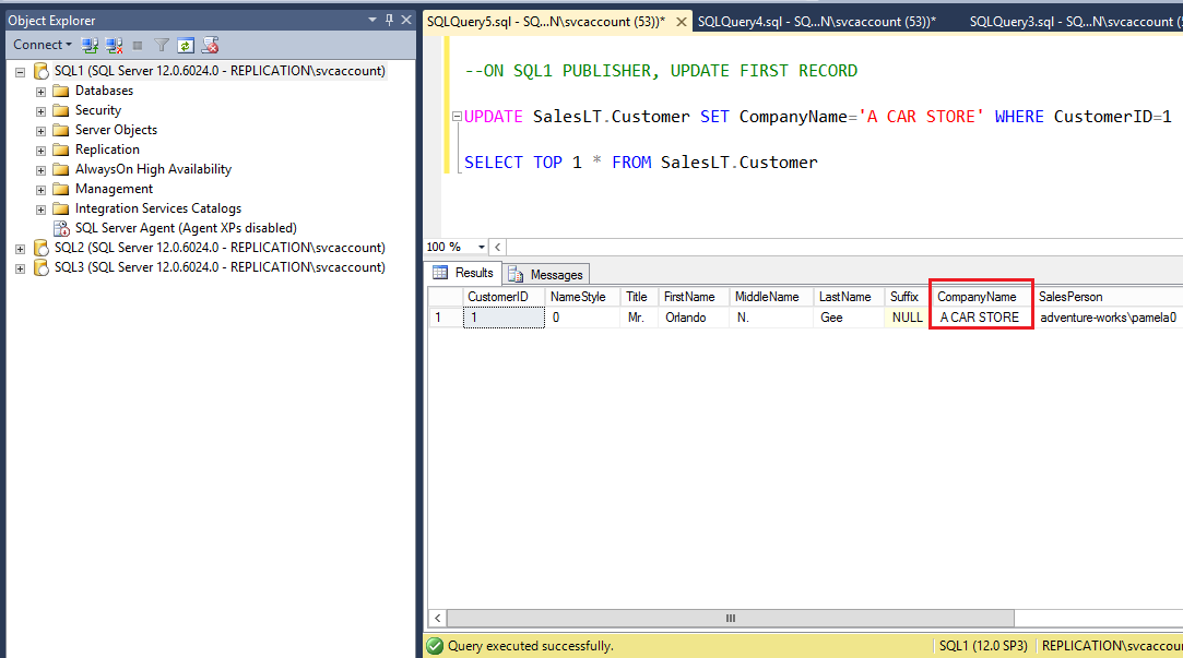On the Publisher SQL1, we will update the CompanyName Column value of the table CUSTOMER