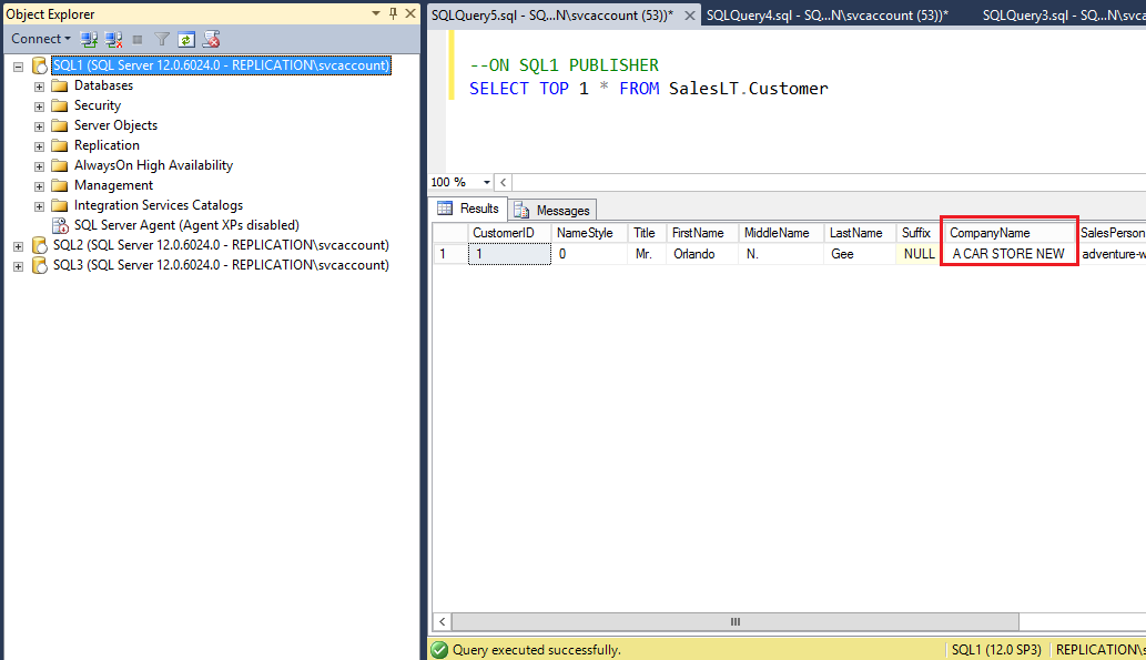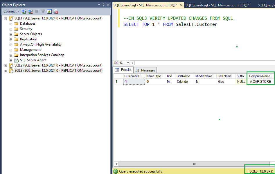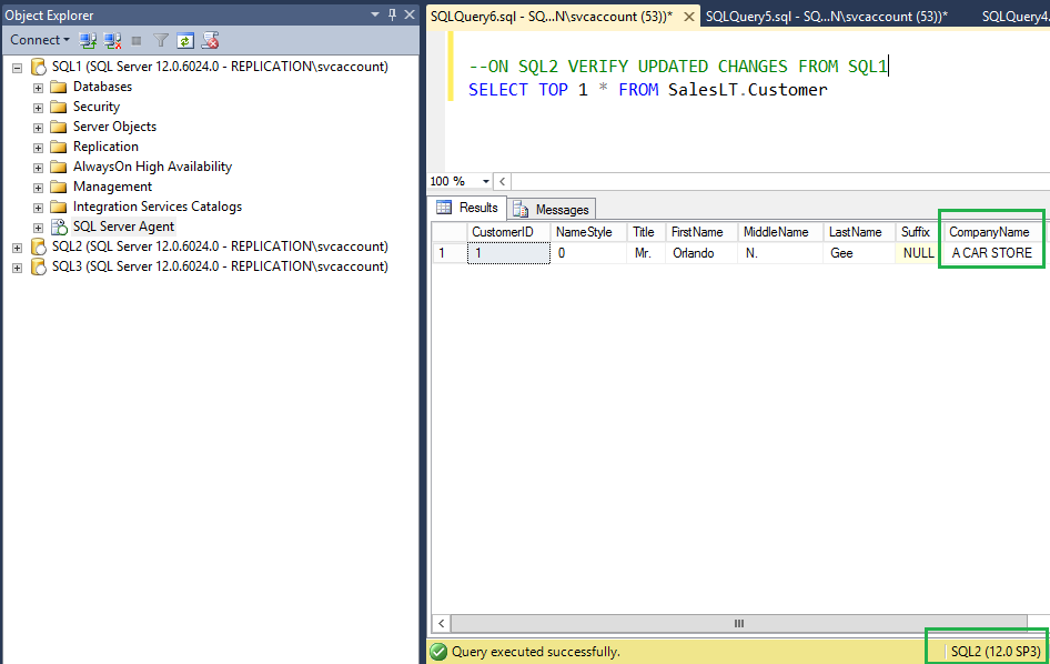 On the Peer node SQL3, verify new value has been updated for the CompanyName column as shown in the following fig