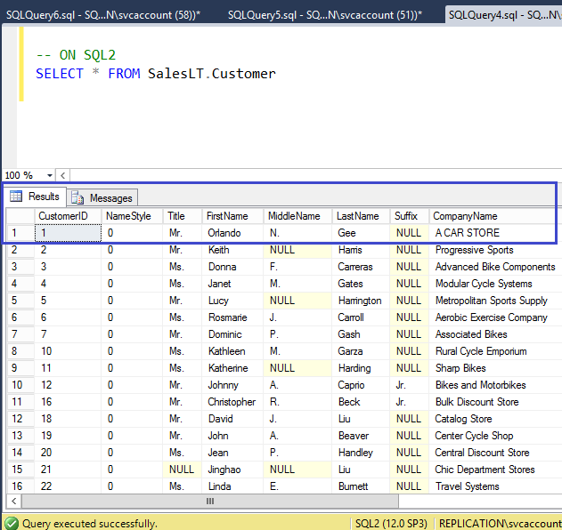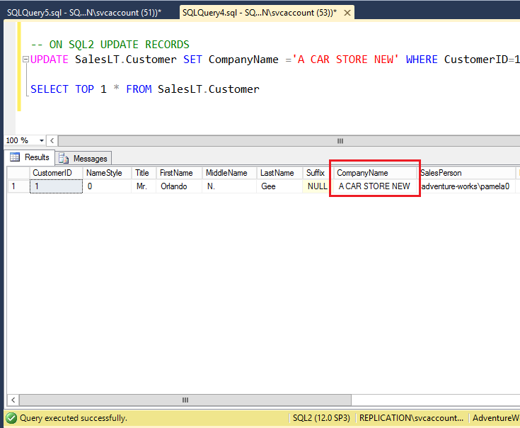 On the Peer node SQL2, verify new value has been updated for the CompanyName column as shown in the following fig