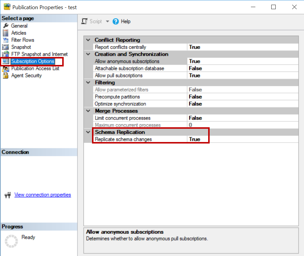 To illustrate this let us create a merge publication with replicate schema changes option enabled.
