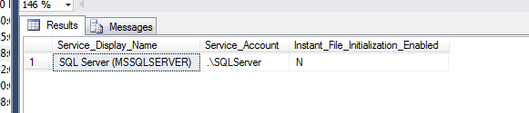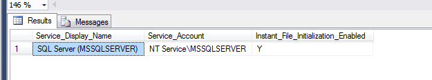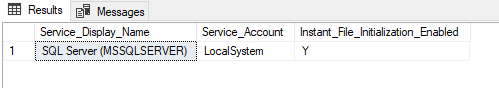 - Instant file initialization is only available if the SQL Server (MSSQLSERVER) service account has been granted SE_MANAGE_VOLUME_NAME.