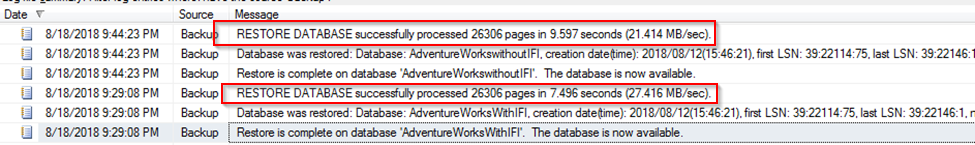 Using the filtering feature for the SQL Server logs, we can get the speed of the restores.