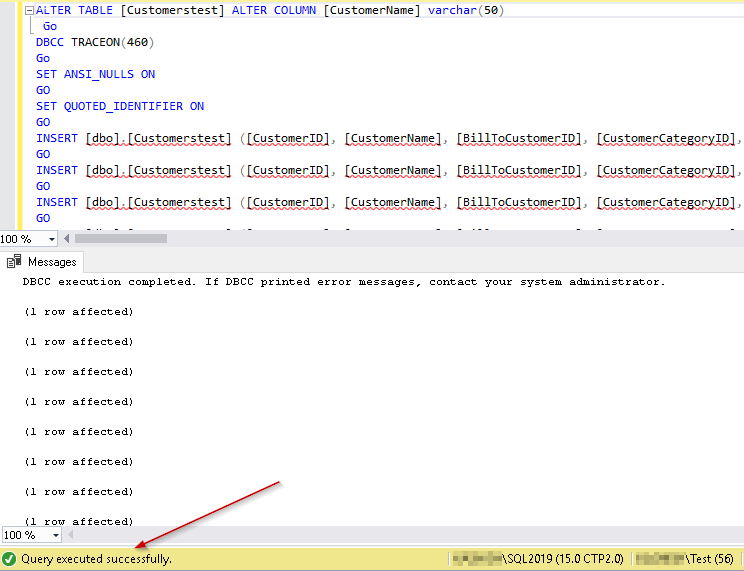 In the below example, we modified the column [CustomerName] to varchar (50) from varchar(30) and executed the example 2 query. This time it executes successfully.