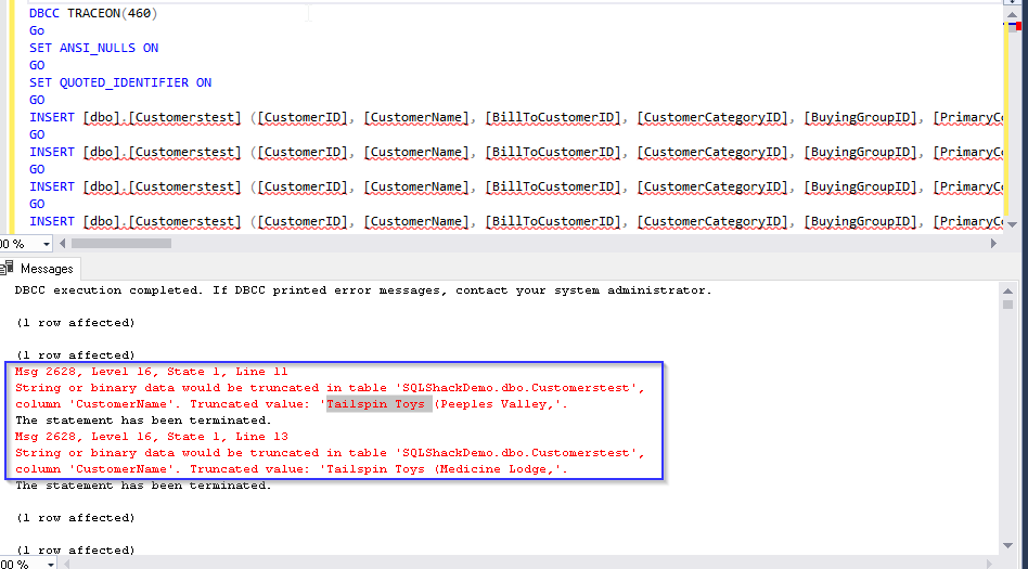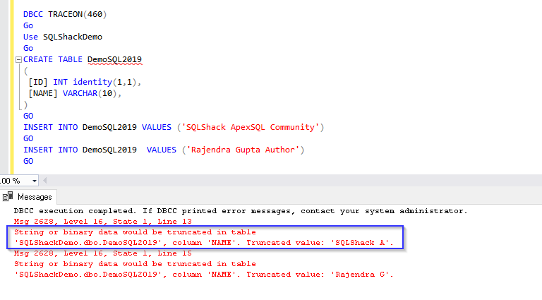 In SQL Server 2019, we need to enable trace flag 460 using DBCC TraceOn. This trace flag displays the SQL truncate error message – “String or binary data would be truncated in table ‘%.*ls’, column ‘%.*ls’. Truncated value: ‘%.*ls’.”