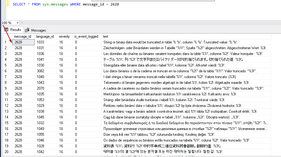 We can look this message into sys. messages table in SQL Server 2019; message id 2628 contains this SQL truncate error message. We can see the table contains error messages for the same error code in the different language. SQL Server picks up the correct message_id based on the collation setting which is the language id in this table.
