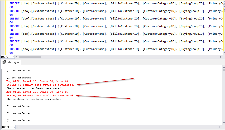 We can notice here that the table involves many columns and we are trying to insert multiple records in our example. Now, we have the same SQL truncate error message, but we did not get any clue about which row is causing the issue. Due to a large number of insert statements, it would be difficult to fix this issue. This is the behavior until SQL Server 2017. Now in below section let us see how SQL Server 2019 solves this issue.