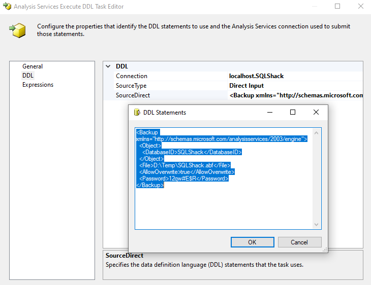 To perform the SSAS database backup, we can use the Analysis Services Execute DDL Task control flow task in SSIS.