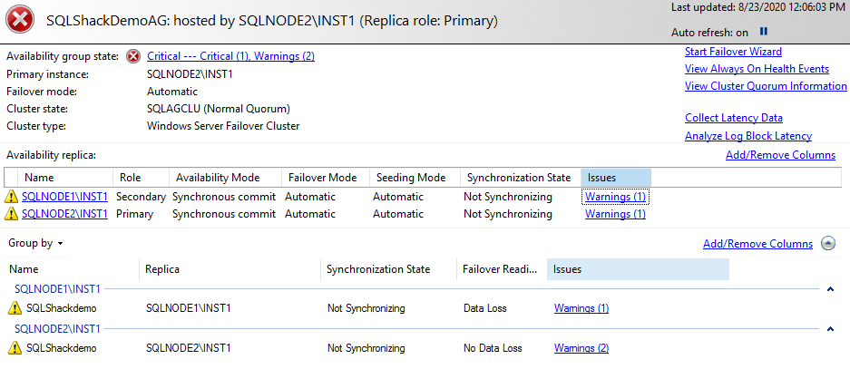 In the AG dashboard, you get warning and errors because databases are not synchronized.
