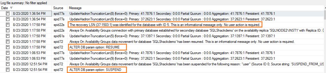 It logs the events in the SQL Server error logs as well. In the below screenshot, we see a few highlighted logs about the suspend, resume, and recovery LSN.