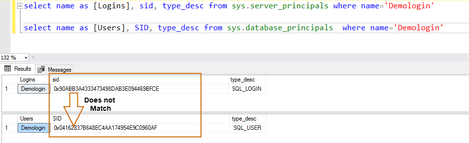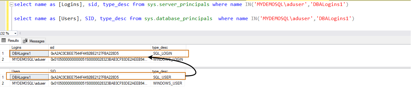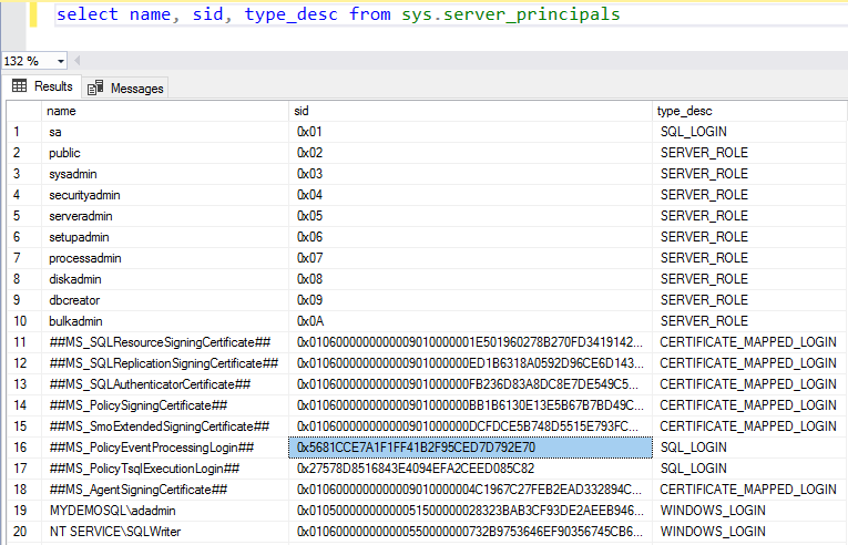 - Server-level principal: Login – The master database has a login and contains a SID. You can query sys.server_principals to check login and their SID’s