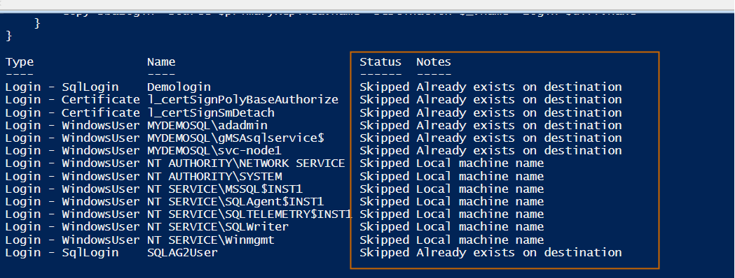 If the logins exist on both the primary and secondary replica, it skips it and gives information in the Status column.
