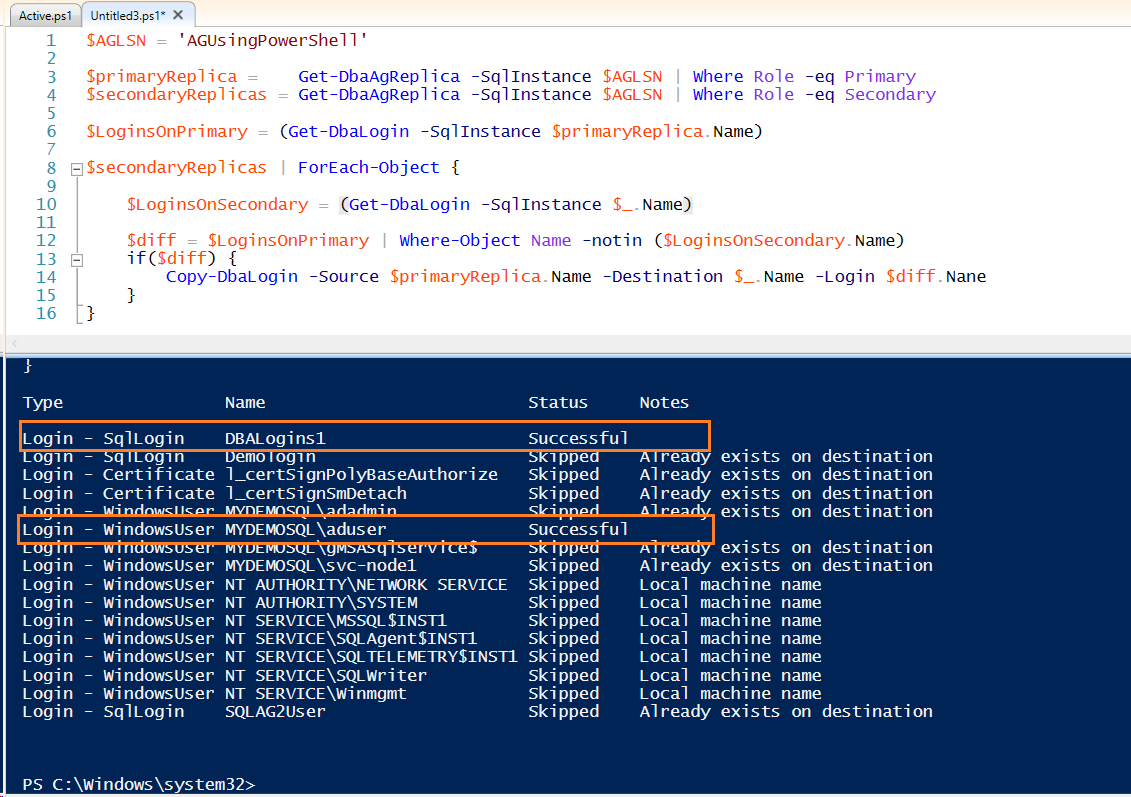 $AGLSN = 'AGUsingPowerShell' $primaryReplica = Get-DbaAgReplica -SqlInstance $AGLSN | Where Role -eq Primary $secondaryReplicas = Get-DbaAgReplica -SqlInstance $AGLSN | Where Role -eq Secondary $LoginsOnPrimary = (Get-DbaLogin -SqlInstance $primaryReplica.Name) $secondaryReplicas | ForEach-Object { $LoginsOnSecondary = (Get-DbaLogin -SqlInstance $_.Name) $diff = $LoginsOnPrimary | Where-Object Name -notin ($LoginsOnSecondary.Name) if($diff) { Copy-DbaLogin -Source $primaryReplica.Name -Destination $_.Name -Login $diff.Nane } } |