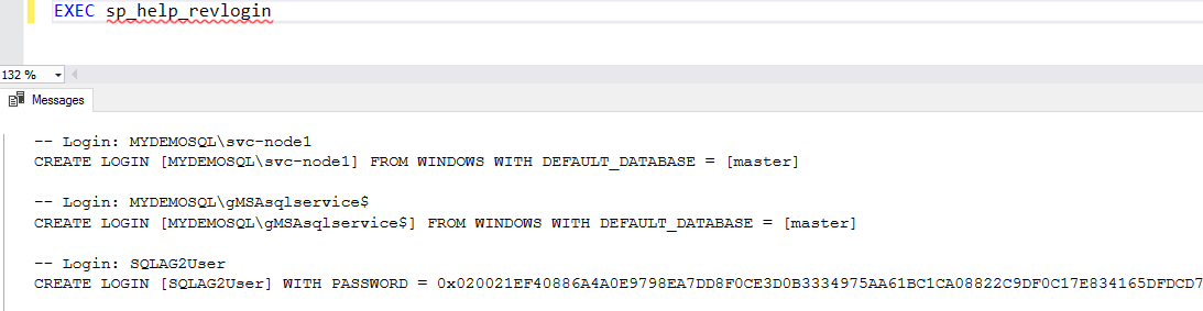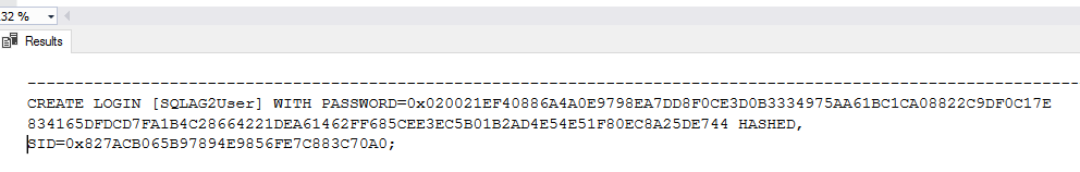 SELECT N'CREATE LOGIN ['+sp.[name]+'] WITH PASSWORD=0x'+ CONVERT(nvarchar(max), l.password_hash, 2)+N' HASHED, '+ N'SID=0x'+CONVERT(nvarchar(max), sp.[sid], 2)+N';' FROM master.sys.server_principals AS sp INNER JOIN master.sys.sql_logins AS l ON sp.[sid]=l.[sid] WHERE sp.name='SQLAG2User' |