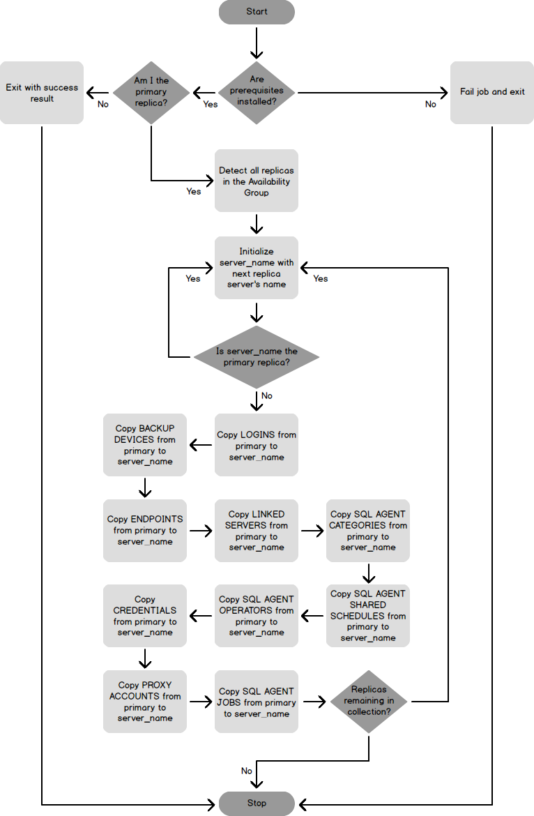 A notable limitation of this process is that it does not update existing objects. Jobs which already exist but were updated, will not be altered. I chose to omit that functionality because it presents merge complications and problems. For example, the cleanest way to handle the process would be to drop and create the object each time the synchronization runs. If that happened, however, there would be gaps when logins didn’t exist and applications would fail to connect, SQL Agent jobs would lose history, and/or the processing of a job would fail because it was dropped part way through executing.