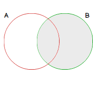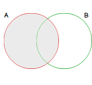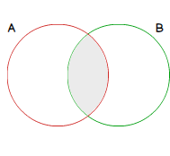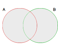 Following convention will be used for these examples: A is represented by red circle while green circle represents Set B. The results of an operator is the grayscaled parts of those circles.