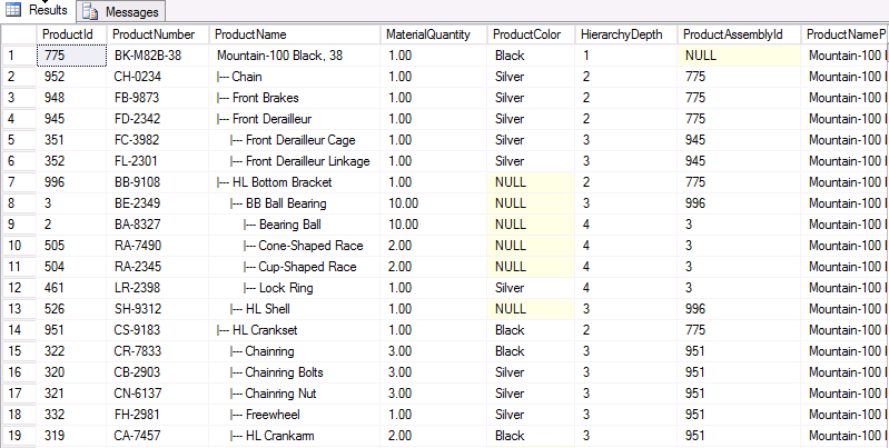 WITH MaterialDetails ( ProductId, ProductNumber, ProductName, MaterialQuantity, ProductColor, HierarchyDepth, ProductAssemblyId, ProductNamePath ) AS ( SELECT p.ProductID, p.ProductNumber, CAST(p.Name AS varchar(8000)), CAST (1 AS DECIMAL (8, 2)), p.Color, 1, NULL, CAST(P.Name AS VARCHAR(MAX)) FROM Production.Product AS p INNER JOIN Production.BillOfMaterials AS bom ON bom.ComponentID = P.ProductID AND bom.ProductAssemblyID IS NULL AND ( bom.EndDate IS NULL OR bom.EndDate > GETDATE() ) UNION ALL SELECT -- current product informations p.ProductID, p.ProductNumber, -- hierarchical tree visualization CAST (REPLICATE(' ', md.HierarchyDepth - 1) + '|--- ' + P.Name AS VARCHAR (8000)), -- current assembly quantity bom.PerAssemblyQty, -- current product color (when applicable) p.Color, -- we go deeper in hierarchy so... md.HierarchyDepth + 1, -- keep reference of current product identifier md.ProductId, -- this is for display CAST(md.ProductNamePath + '\' + p.Name AS varchar(MAX)) FROM -- take back last recursion results MaterialDetails AS md -- retrieve informations about current level of details INNER JOIN Production.BillOfMaterials AS bom ON md.ProductId = bom.ProductAssemblyID INNER JOIN Production.Product AS p on p.ProductID = bom.ComponentID -- don't forget some parts may not be used anymore WHERE ( bom.EndDate IS NULL OR bom.EndDate > GETDATE() ) ) SELECT ProductId, ProductNumber, ProductName, MaterialQuantity, ProductColor, HierarchyDepth, ProductAssemblyId, ProductNamePath FROM MaterialDetails ORDER BY ProductNamePath ; |