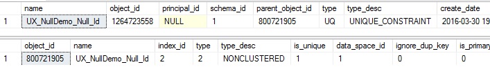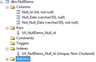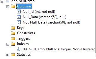 These all accomplish similar goals, but there are differences. The 1st and 2nd options will create unique constraints and do so as non-clustered indexes. The 3rd will do the same, but as a clustered index. Remember that you can only have a single clustered index per table, so if one already exists, creating another will throw an error. The 4th and 5th code snippets also creates unique indexes, but there is an interesting, subtle difference in how these constraints are represented in SQL Server. After executing the 1st code snippet, Management Studio shows the following objects within the NullDemo table: