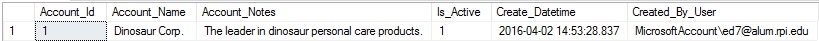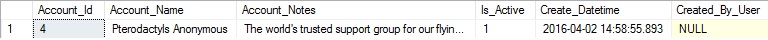 While I only provided the account name and notes, the remaining columns were populated for me using the defaults that we expect and would want. This is a great way to audit data as it is created and simplify INSERT statements.