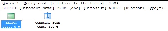 For this query, there were zero reads against the table and the execution plan shows a constant scan. Similar to when we tried to pull NULL from a NOT NULL column, the check constraint provided valuable information to SQL Server about the Dinosaur_Type column and what values it is allowed to contain. Without accessing the table, SQL Server was able to deduce from table metadata and the WHERE clause of my query that what I was looking for was not possible, and knowing that information, it could complete query optimization without any significant load on the server.