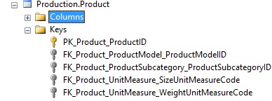 To demo foreign keys, we can use the table Production.Product in Adventureworks, which contains four different foreign keys: