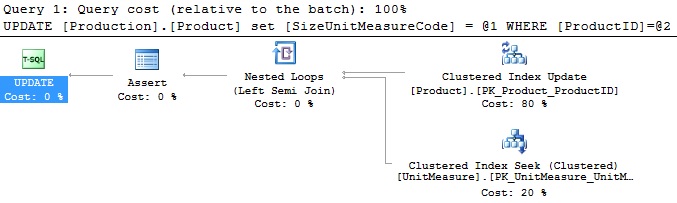 In order to check the foreign key for the value we are assigning, a seek against the UnitMeasure table was required. Since this is a small lookup table that contains 38 rows, the cost of this operation is negligible. The Assert operator is what validates that the values we are writing to Production.Product exist in Production.UnitMeasure. If this were not the case, then the query would fail here with a foreign key conflict error that would look something like this: