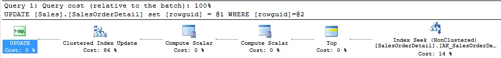 The work of a unique index occurs on an insert or update, when it is necessary to check and see if a value already exists prior to making the change. What does this cost? To investigate, we’ll look at the unique index AK_SalesOrderDetail_rowguid on Sales.SalesOrderDetail. Let’s run a simple update on the table: