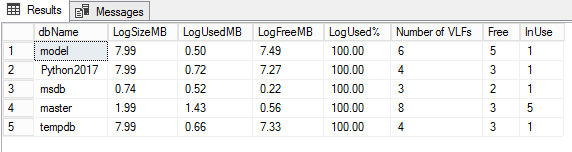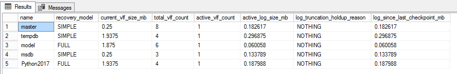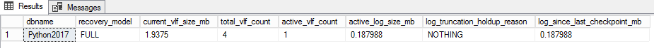 We can see that Python2017 database is using the FULL recovery model. The other columns give the total log size in megabytes. Also, we can see some information about the last time the log was backed up. In this case, the database transaction log was never backed up, so it’s reporting as of January 1, 1900.
