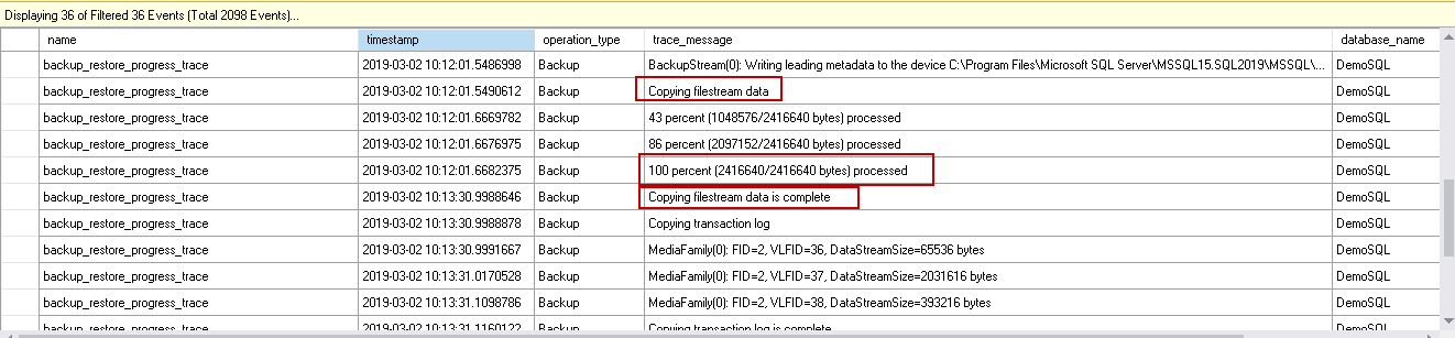 Execute the transaction log backup for FILESTREAM database now and view data in Live Data session window. In the following section, we will explore the output of the extended event session output.
