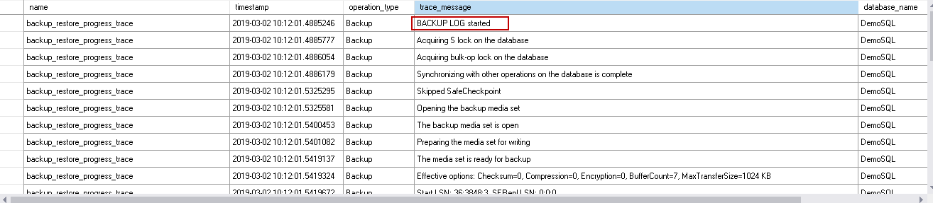 Once we start the log backup process, in the extended event session, we can see a message Backup Log started.
