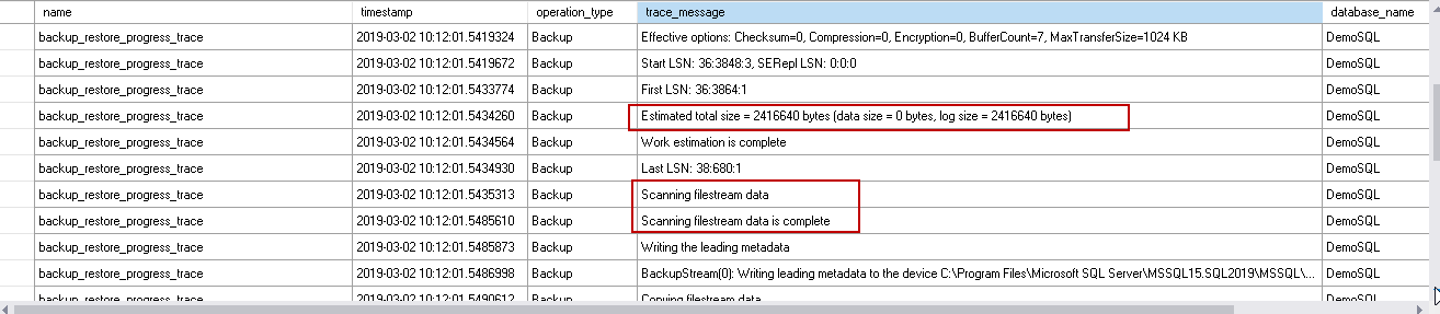 SQL Server performs the estimation of the backup size. If you do not have sufficient free space in the backup drive, you get an error based on this estimated size. You can note the estimated total size is 2416640 bytes, i.e. 2.30 MB. It scans SQL FILESTREAM data after the work estimation. The work estimation size does not include the FILESTREAM container files size required to be backed up.