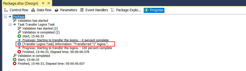 To configure the Transfer Login task, double-click on Transfer Logins Task, specify the source as SQL01 and destination as SQL02 and execute the package: