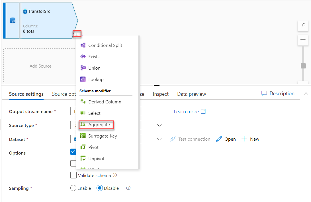 Now the data source is ready. We need to add a new stream to calculate the average value of the source data. To achieve that, click on the plus sign in the graph area and choose to add Aggregate stream, as shown below: