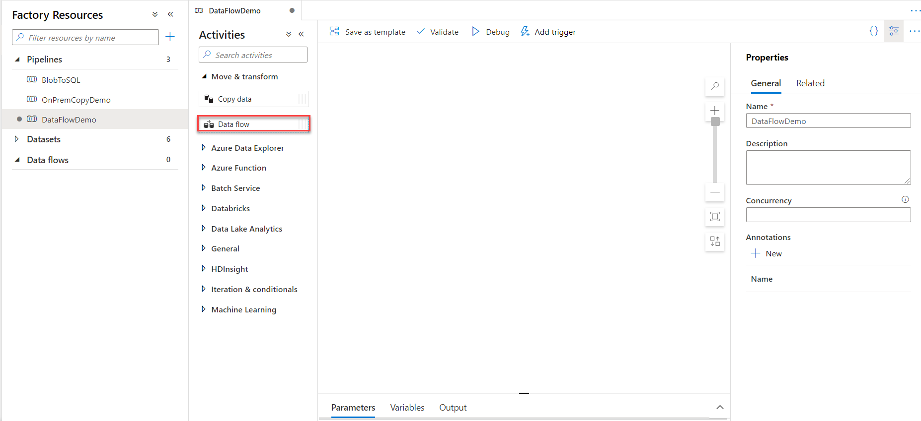 Mapping Data Flows activity can be created individually or within an Azure Data Factory pipeline. In this demo, and in order to test the Data Flow activity execution, we will create a new pipeline and create a Data Flow activity to be executed inside that pipeline.