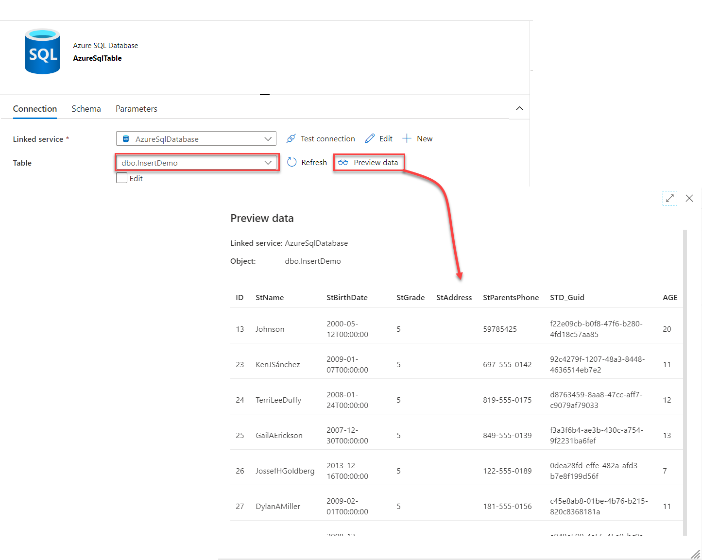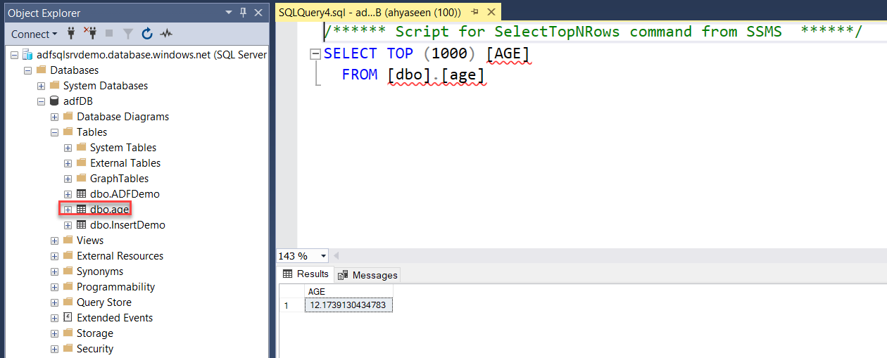 The same result can be verified by connecting to the Azure SQL Database using the SQL Server Management Studio (SSMS) tool and browse for the new table then run the SELECT statement below, and you can see that this value stored in the table matches the value verified from the sink data preview: