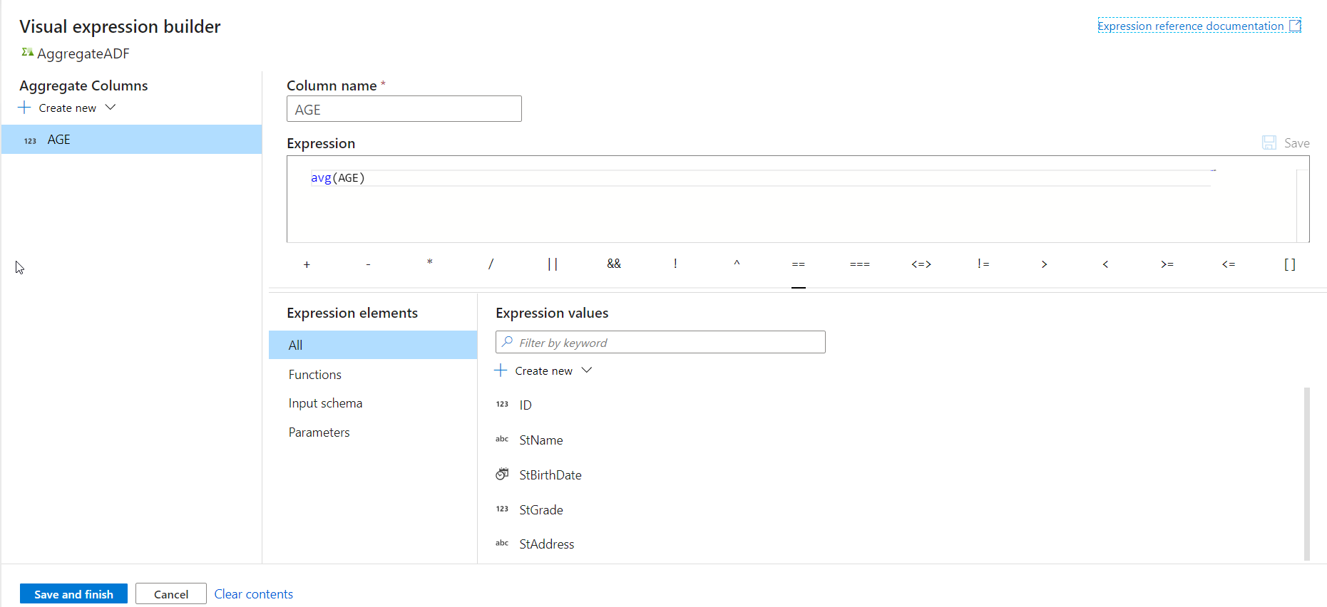 From the opened visual expression builder, specify the expression of the Average aggregate function that will be used to calculate the average value of the users’ age, as shown below:
