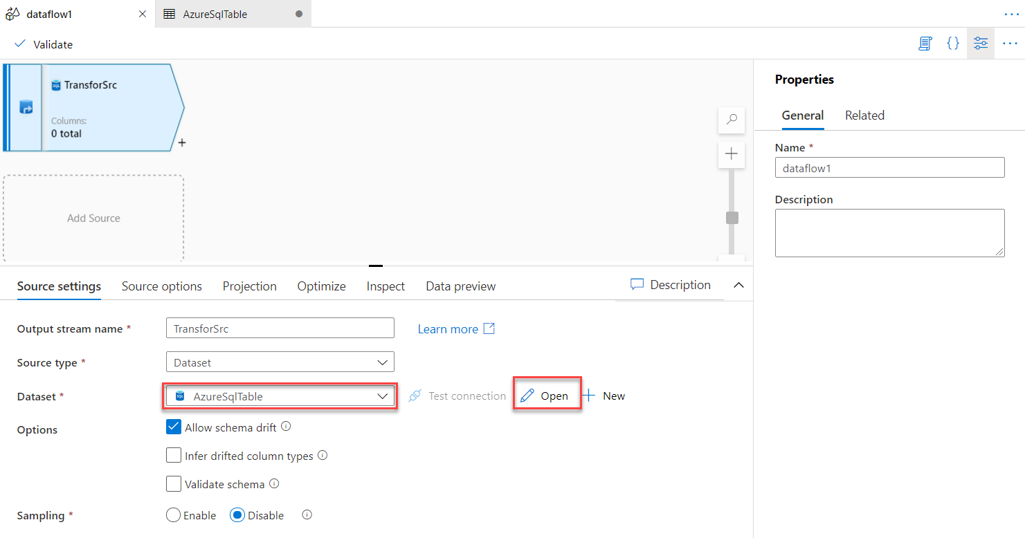 Opening the selected dataset, you can reconfigure the table name and validate the source data store connection and data, as shown below: