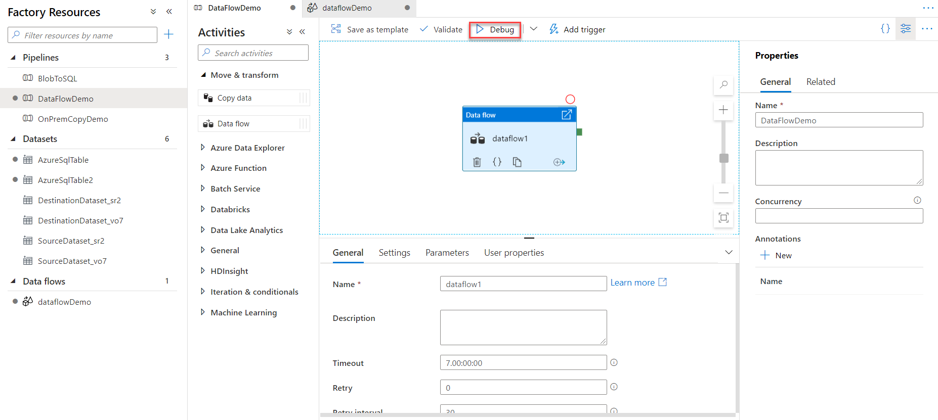 Data Flow activity is configured successfully now. Before publishing the pipeline changes, validate the pipeline then run it using the Debug mode, where the Data Flow Activity will be executed manually under that pipeline, as shown below: