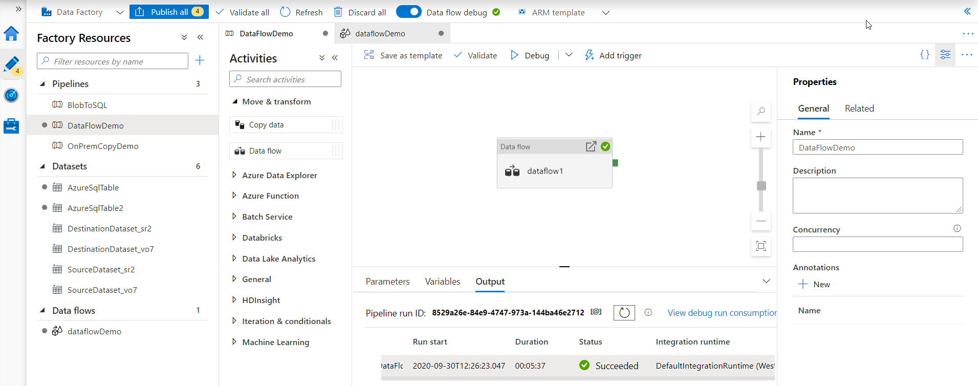 When the pipeline execution is completed, review the output tab and verify that it is executed successfully with no issue. As you are still in the debug mode, you can fix any issue with the data sources, sinks and the transform function within the Data Flow activity, as shown below:
