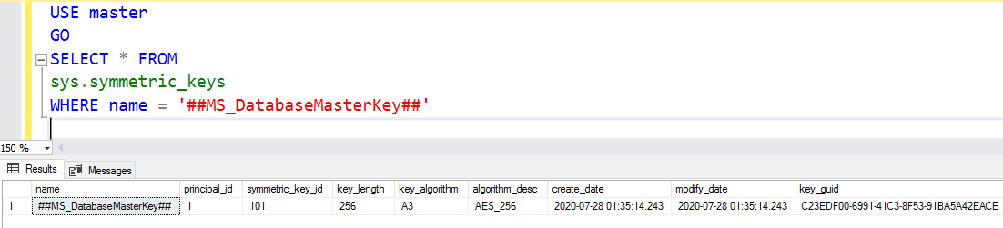 We can query the sys.certificates system object to verify the certificate exists for our SQL instance.