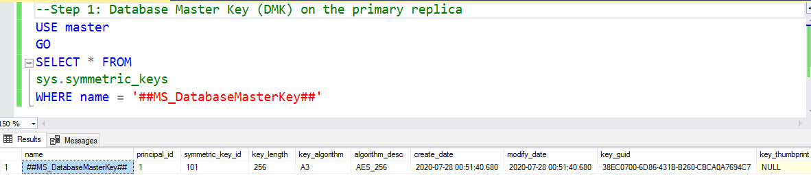 First, you can check if your instance already has a database master key. We already created a DML for the distributed availability group in the earlier article.