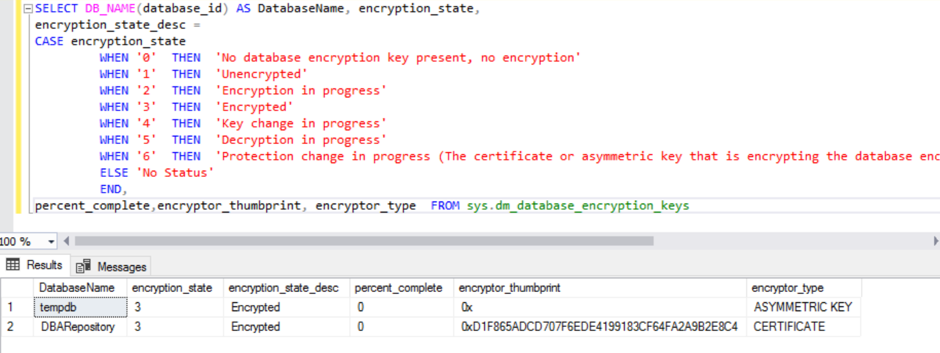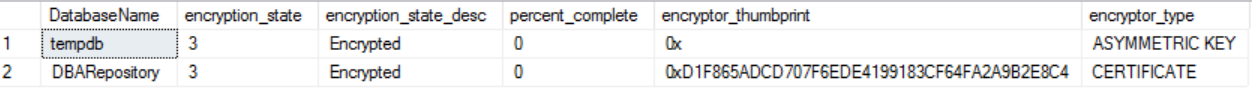 • Is_encrypted: The value “1” denotes TDE is enabled for the corresponding database