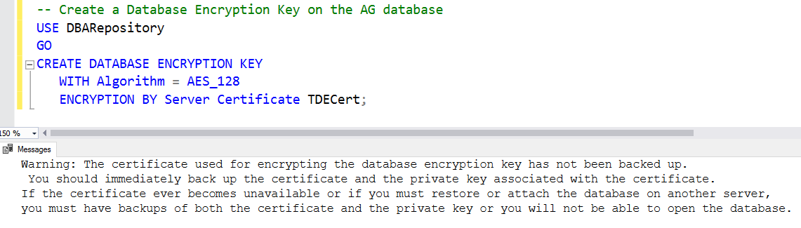 Execute the script under the AG database context and specify the certificate name in the parameter ENCRYPTION BY Server Certificate argument. In the output, you get a warning message. It asks you to back up the certificate and the private key. Don’t worry about it. We take the backup in the next step.
