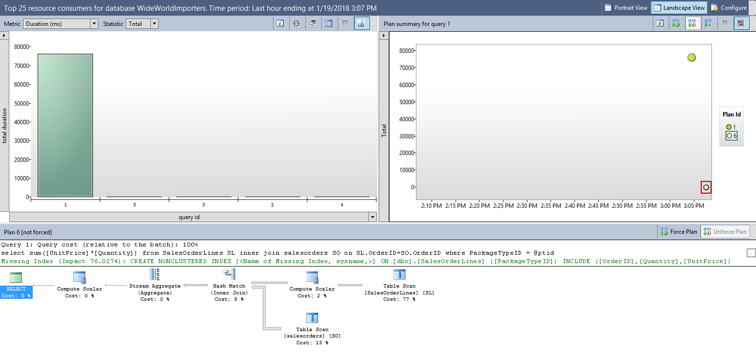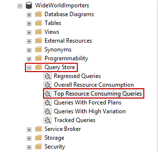 To view the Query Store performance dashboard, browse the database, explore the Query Store component and select the Top Resource Consuming Queries option