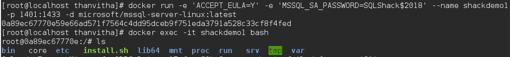 docker run -e ‘ACCEPT_EULA=Y’ -e ‘MSSQL_SA_PASSWORD=SQLShack$2018’ –name shackdemo1 -p 1401:1433 -d microsoft/mssql-server-linux:latest