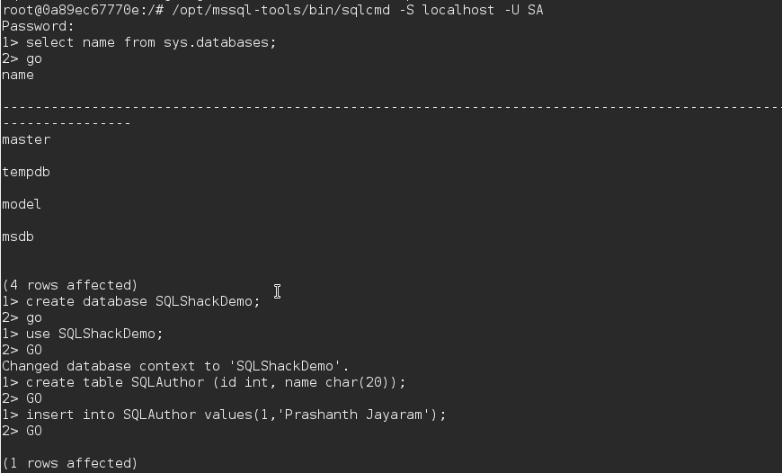 Now, a Bash session is opened for SQLShackDemo1 container. Connect to the SQL instance using sqlcmd and create a new database named SQLShackDemo.
