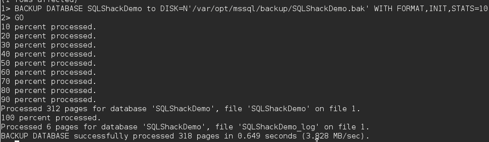 BACKUP DATABASE [SQLShackDemo] TO DISK = N’/var/opt/mssql/backup/SQLShackDemo.bak’ WITH FORMAT, INIT, COMPRESSION,STATS = 10